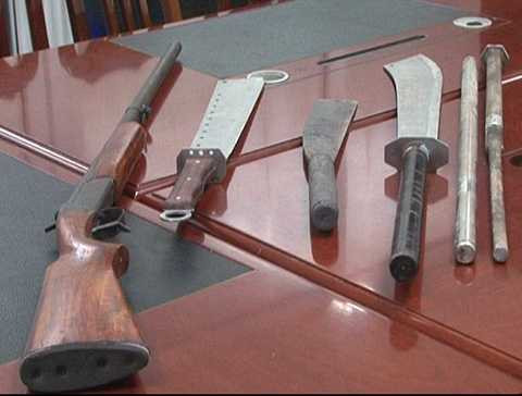 Cùng với việc bắt, vận động đầu thú 12 đối tượng, cơ quan điều tra đã thu giữ một số hung khí gồm súng bắn đạn hoa cải, kiếm, tuýp sắt.