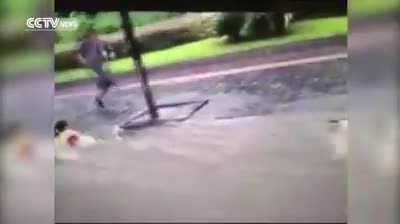 20/07/2016 11:55:00 +07:00Mưa lớn khiến đường phố ngập lụt ở huyện Xạ Hồng, tỉnh Tứ Xuyên (Trung Quốc), một em bé bị nước lũ cuốn đi may mắn được người đàn ông trên đường nhanh tay kéo lên.