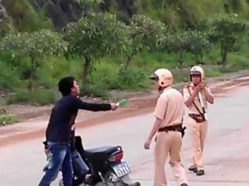 Thấy thanh niên quá hung hãn, quá khích, 2 CSGT tỏ ra khá thận trọng. Người thanh niên như càng được đà, cầm vỏ chai bia vỡ vụt ngang mặt 1 CSGT đang tìm cách tiếp cận. Rất may người CSGT đã tránh được.
