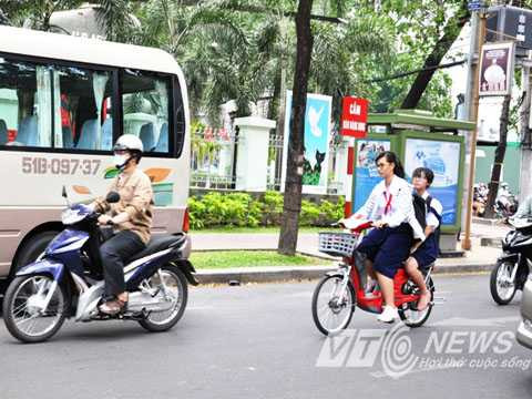 Có mặt trên nhiều tuyến đường Sài Gòn, PV VTC News ghi nhận, hầu hết những người điều khiển xe đạp điện, đa phần là các em học sinh vẫn không tuân thủ đội nón bảo hiểm theo quy định.