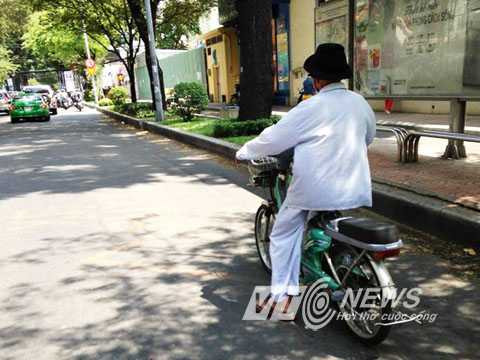 | Một cụ ông đi xe đạp điện vẫn không đội nón bảo hiểm |