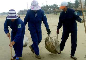 Ông Phan Minh Hải, Phó ban Quản lý Bán đảo Sơn Trà và các bãi biển du lịch Đà Nẵng xác nhận đang có tình trạng dầu vón cục tấp vào bờ, trải dài khoảng 1 km từ bãi biển Mỹ Khê đến bãi biển T.18, vốn là những bãi biển du lịch trọng điểm của Đà Nẵng. “Sau khi kiểm tra, chúng tôi đã yêu cầu Xí nghiệp Môi trường sông biển (Dnurenco, thuộc Sở Tài nguyên và Môi trường Đà Nẵng) dọn dẹp, có thể một vài hôm là hết!” - ông Hải nói.