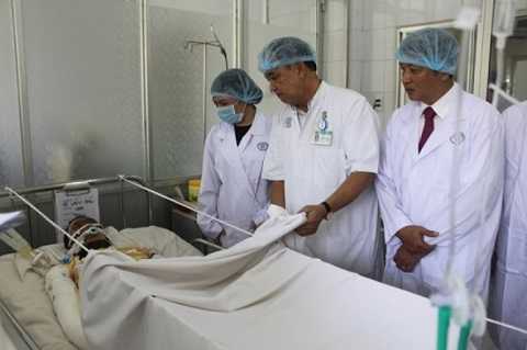 | Bộ trưởng Y tế Nguyễn Thị Kim Tiến thăm anh Đấu lúc anh điều trị tại BV Chợ Rẫy. |