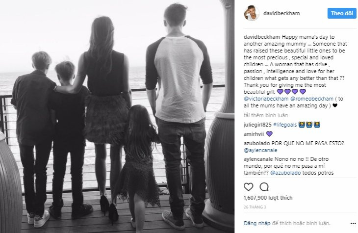 “Lời chúc mừng gửi tới một người mẹ tuyệt vời… Một người đã nuôi dạy con của anh trở thành những đứa trẻ quý giá, đặc biệt và đáng yêu. Một người phụ nữ đầy đam mê, thông minh và tình yêu dành cho con cái lớn hơn mọi thứ trên đời. Cám ơn em đã dành cho anh món quà tuyệt vời nhất”, David Beckham viết chúc mừng nhân ngày của mẹ
