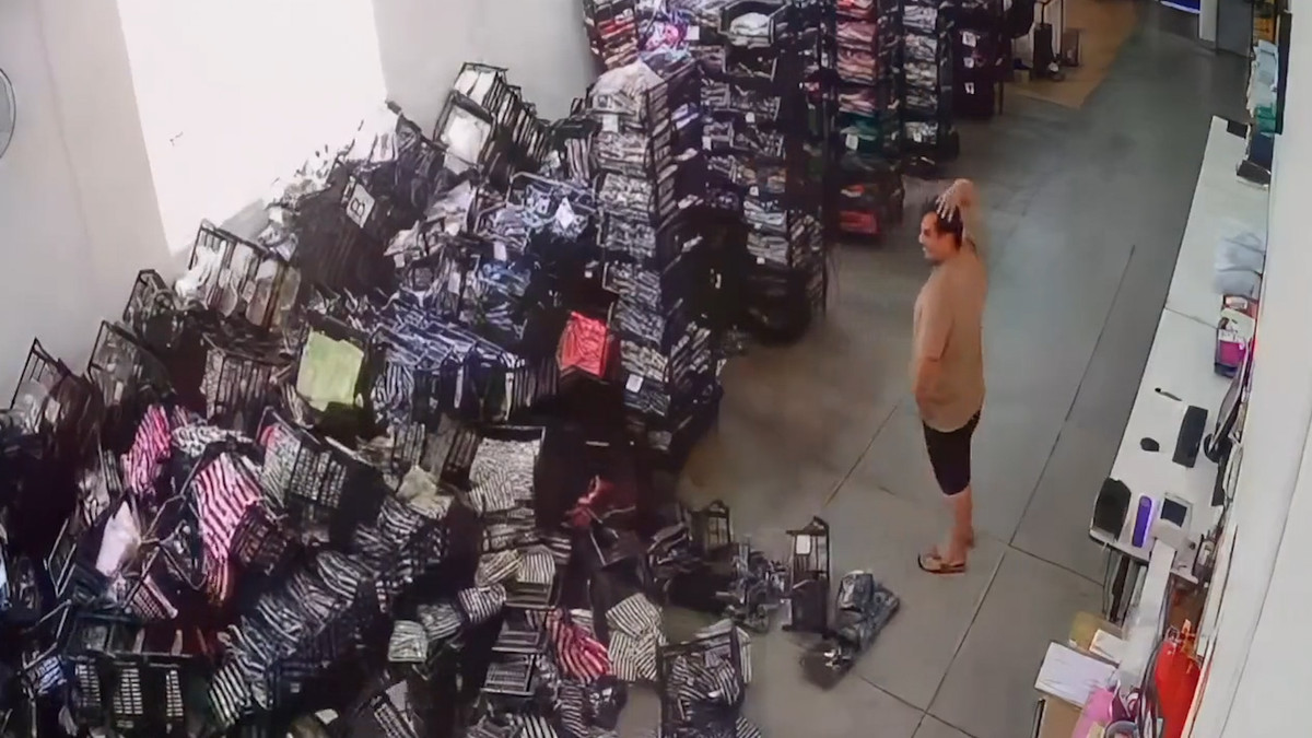 Nhân viên cửa hàng thời trang tại Sao Paulo, Brazil vô tình đẩy chiếc ghế văng vào dãy kệ hàng hóa, tạo nên hiệu ứng domino khiến hàng loạt dãy kệ ngã nhào.