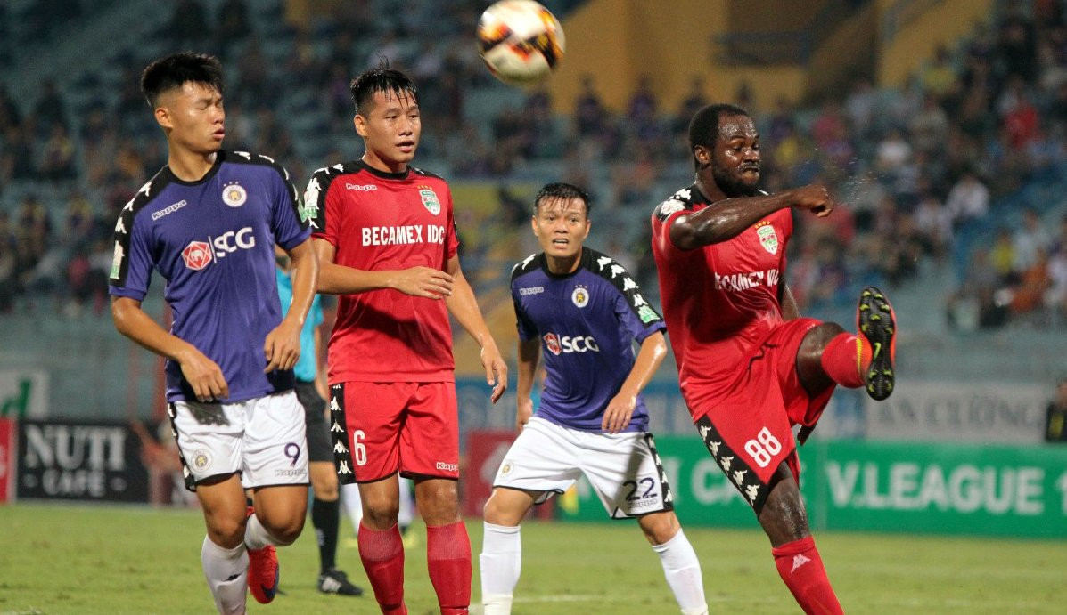 Phạm Văn Thành (áo xanh) mang áo số 9 ở CLB Hà Nội để đá tiền đạo nhưng sau đó phải xuống chơi ở vị trí hậu vệ cánh.