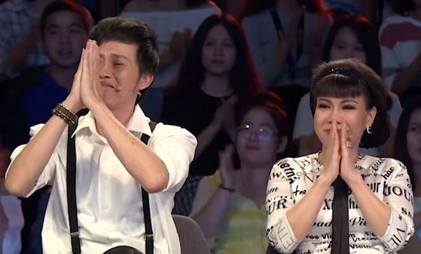 Hoài Linh và Việt Hương chấp tay bật khóc.