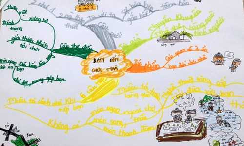 Cô Hiền chia sẻ, đầu tiên phải hướng dẫn cách làm cho học sinh nắm được vì vẽ sơ đồ tư duy không như sơ đồ thông thường, đặc biệt là với môn văn, yêu cầu học sinh phải tập trung để nắm bắt được thông tin, sàng lọc những gì là cốt yếu, tìm được từ khóa và hình ảnh để thể hiện cho phù hợp…