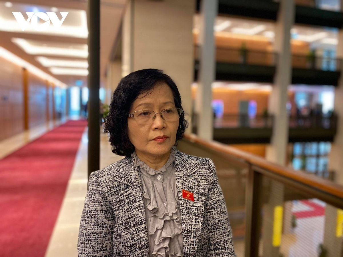 Đại biểu Trần Thị Quốc Khánh (Đoàn Hà Nội) trả lời báo chí bên hành lang Quốc hội.