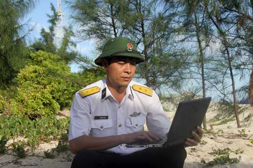 | Ở đảo Sơn Ca, trung tá Vũ Hùng Lâm, trưởng ban thanh niên Bộ tư lệnh Hải quân vẫn có thể kiểm tra thư và làm việc với đất liền cách hàng trăm hải lý. |