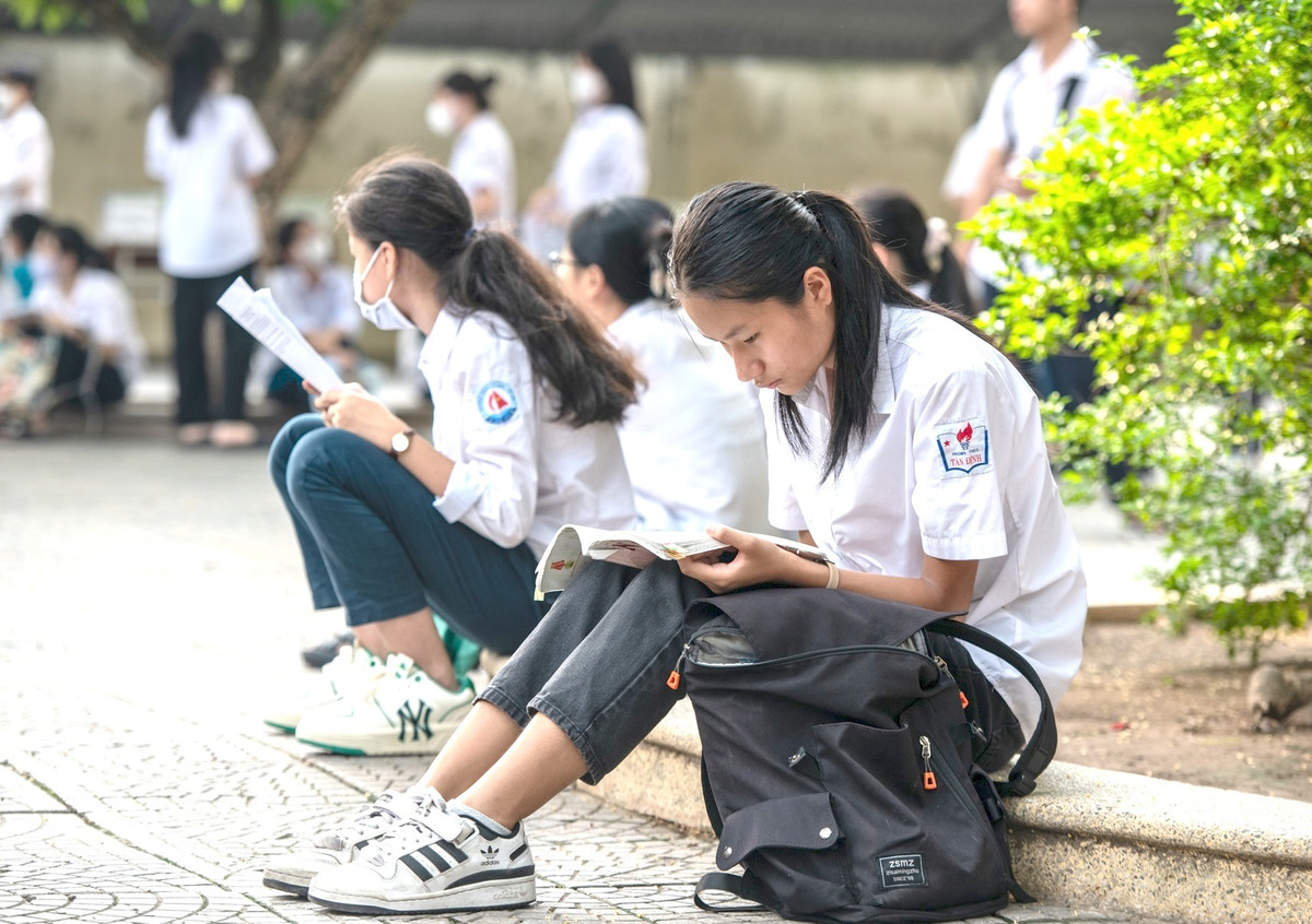 Thí sinh tranh thủ ôn bài trước khi vào phòng thi. (Ảnh: Zing.vn)