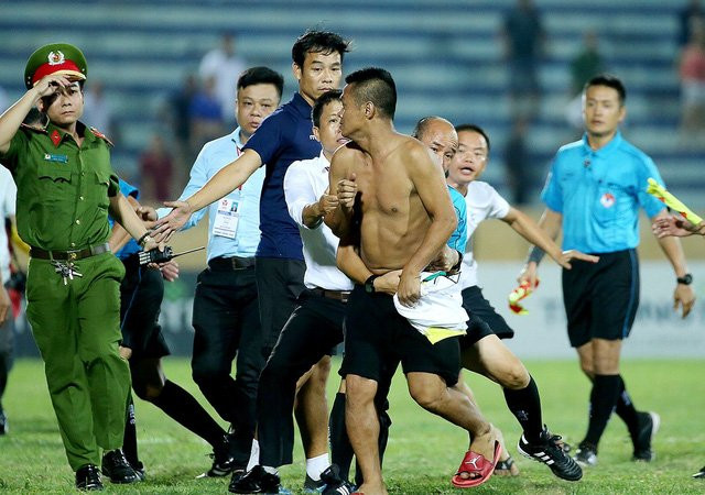 Thậm chí, một cổ động viên cởi trần đã vượt rào, lao xuống sân tấn công trọng tài Trần Đình Thịnh. Rất may thời điểm đó trọng tài thứ tư là ông Ngô Quốc Hưng đã kịp phản ứng, ôm cổ động viên này trước khi cảnh sát tiếp cận và đưa cổ động viên quá khích ra khỏi sân.