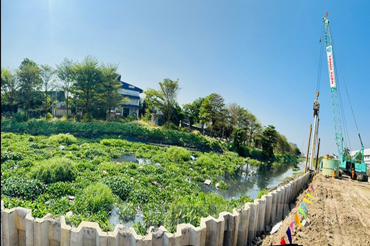 Sau gần 12 tháng triển khai thi công, hạng mục xây dựng kè bờ kênh đạt 48,7% với 25.144 cây/51.587 cây; hạng mục thi công cọc bê tông ly tâm đạt 36,3%; xử lý 51% nền đất yếu bằng cọc xi măng đất…