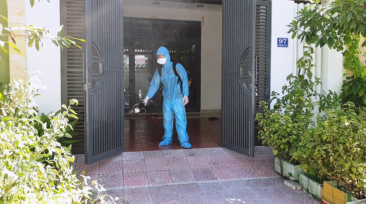 Lực lượng y tế phun khử trùng tại khu vực nhà bệnh nhân 416 sinh sống.