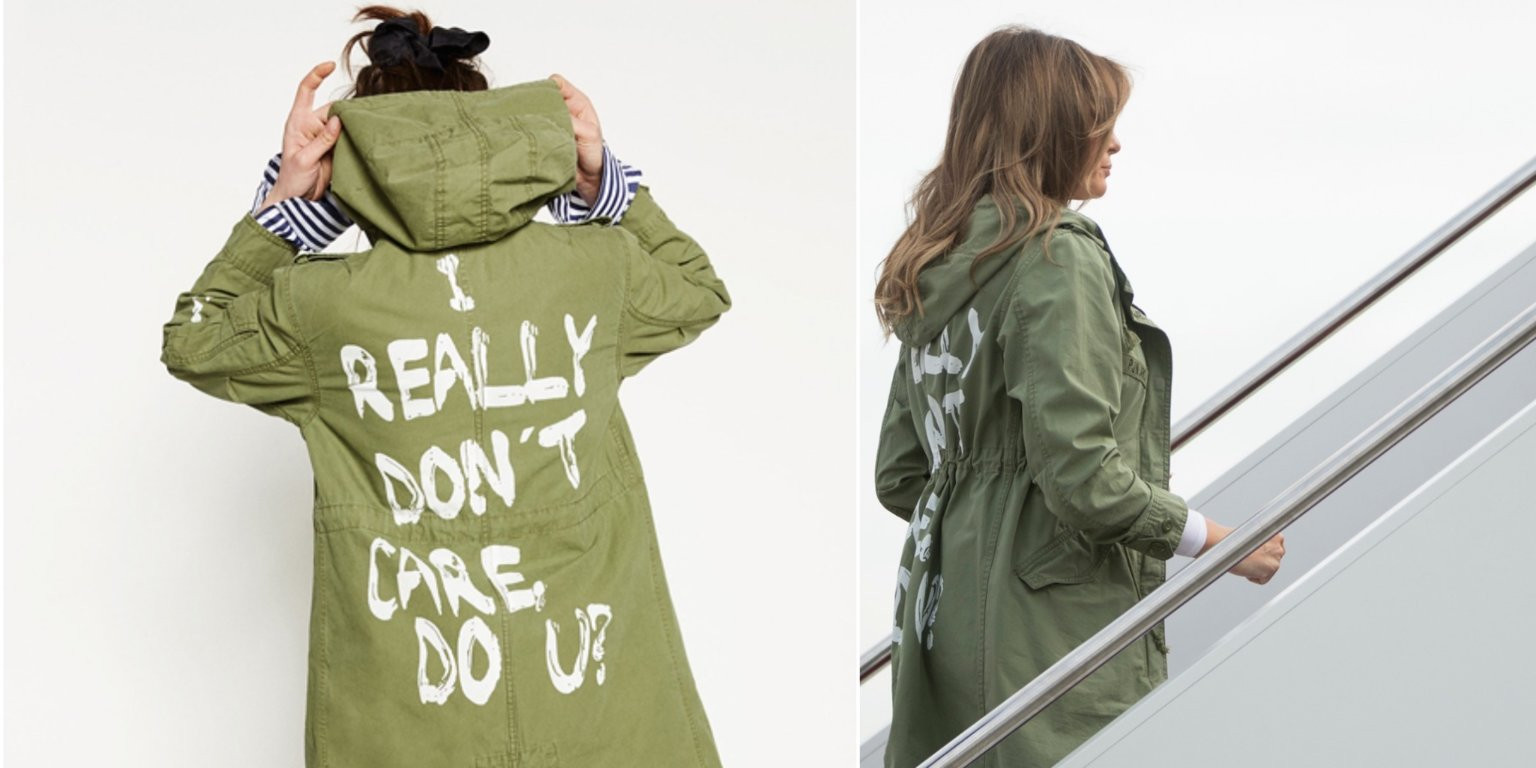Tháng 6/2018, phu nhân Tổng thống Mỹ Melania Trump tràn ngập các tiêu đề báo khi bất ngờ đến thăm cơ sở nhập cư của Cục Sức khỏe và Con người Mỹ, nơi những đứa trẻ nhập cư tại McAllen, Texas ở. Trong chuyến đi, những hình ảnh chụp lại bà cho thấy chiếc áo khoác màu xanh olive có dòng chữ “Tôi thực sự không quan tâm, bạn thì sao?” in phía sau.
