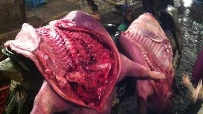 Thịt lợn chết, bốc mùi được bán với giá 20.000 đồng/kg tại chợ đầu mối phía Nam. Ảnh: Mai Linh