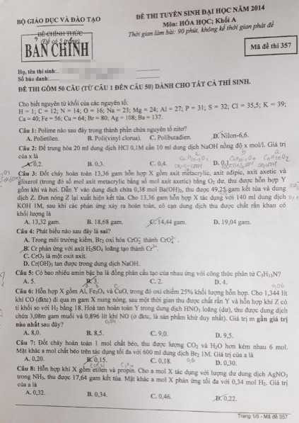 (VTC News) - Báo điện tử VTC News cập nhật đề thi, đáp án môn Hóa học kỳ thi tuyển sinh đại học 2014.