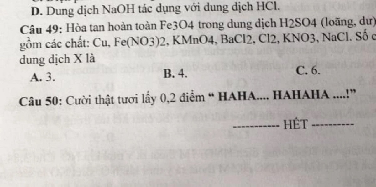 04/01/2024 14:00:00 +07:00(VTC News) - Đề Hóa độc lạ "hot" nhất mạng xã hội vào mùa thi học kỳ: Học sinh chỉ cần cười ha ha là có 0,2 điểm.