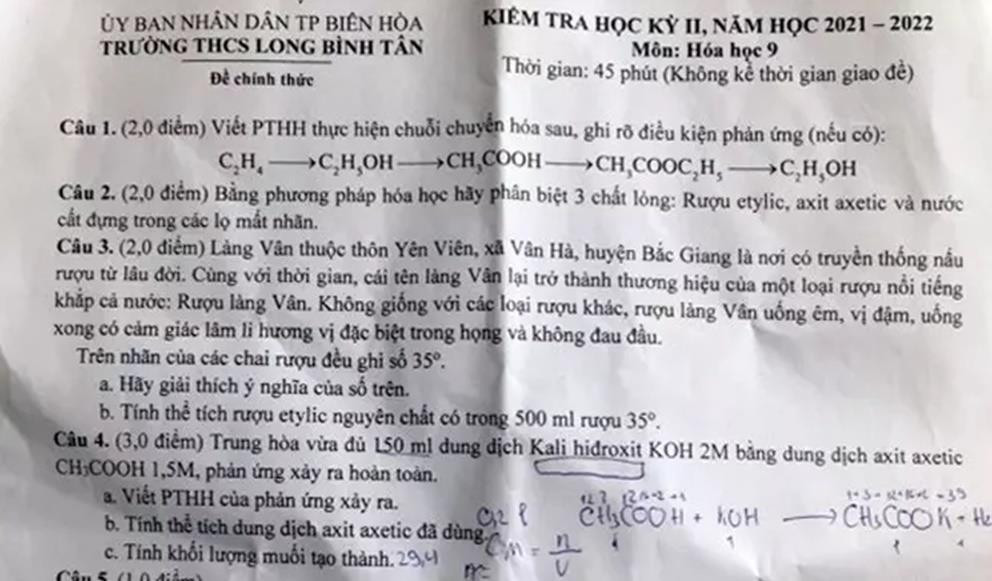 Trước đó, câu hỏi số 2 trong đề kiểm tra môn Hóa học lớp 9 (học kỳ 2 năm học 2021 – 2022) vào ngày 11/5 tại Trường THCS Long Bình Tân có nội dung:
