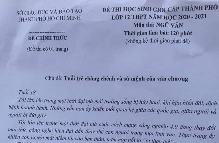 Sáng 17/3, học sinh lớp 9 và lớp 12 tại TP.HCM bước vào kỳ thi học sinh giỏi cấp thành phố năm 2021. Trong đó, đề thi Văn của lớp 12 được đánh giá hay, sáng tạo.