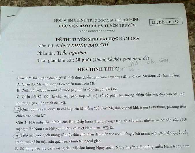 Hôm nay, các thí sinh sẽ dự thi năng khiếu vào các ngành báo chí của Học viện Báo chí và Tuyên truyền. Báo điện tử VTC News giới thiệu đề đi trắc nghiệm năng khiếu báo chí vào Học viện Báo chí và tuyên truyền năm 2016 như sau (mã đề 489).
