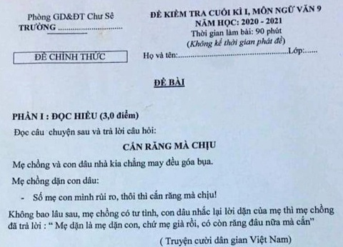 Phần nội dung đọc hiểu của đề thi Ngữ văn lớp 9 cuối học kỳ I có cho ngữ liệu rằng: