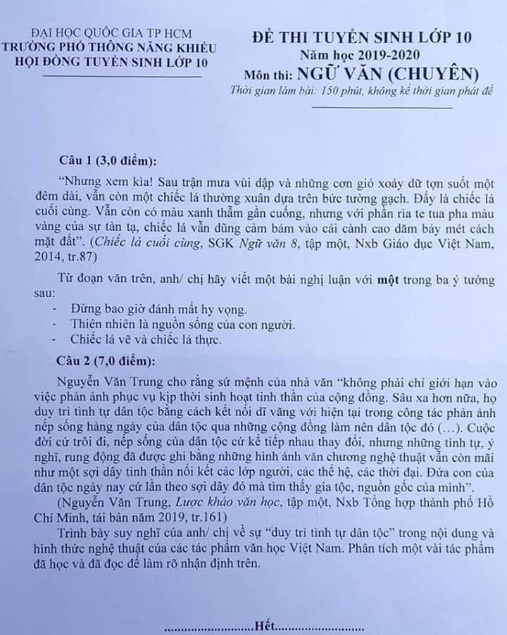 Đề thi Ngữ văn lớp 10 Trường Phổ thông Năng khiếu. (Ảnh: Phan Thế Hoài)