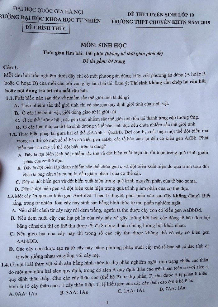 Đề thi Sinh học, Trường chuyên khoa học tự nhiên gồm 5 câu trắc nghiệm và 9 câu tự luận.