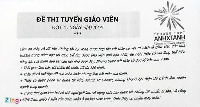 “Cám ơn thầy cô đã tới! Chúng tôi hy vọng được hợp tác với thầy cô với tư cách là giáo viên của nhà trường trong năm học tới đây. Để tìm được ứng viên phù hợp nhất, đề nghị thầy cô vui lòng thể hiện năng lực của mình qua vài câu hỏi nhỏ dưới đây. Nhưng trước hết thầy cô đọc kỹ các chú ý sau