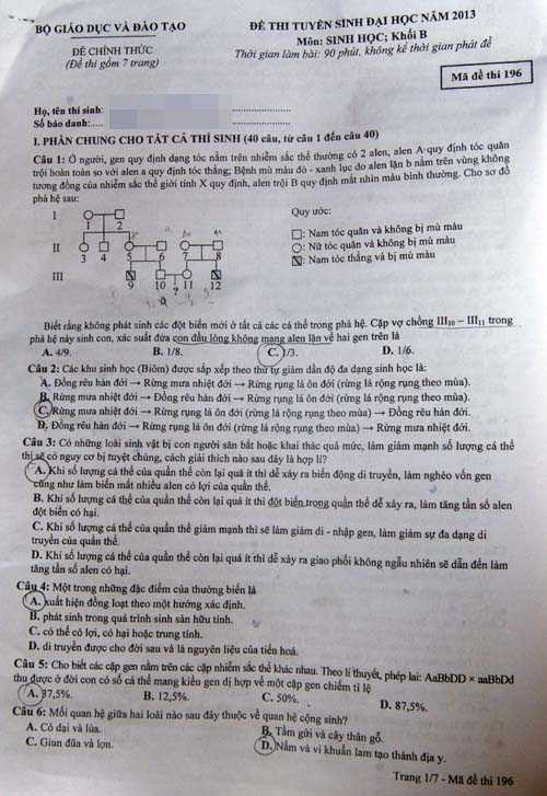 (VTC News)- Báo điện tử VTC News cập nhật đề thi chính thức và gợi ý lời giải môn Sinh học khối B kỳ thi ĐH, CĐ năm 2013.