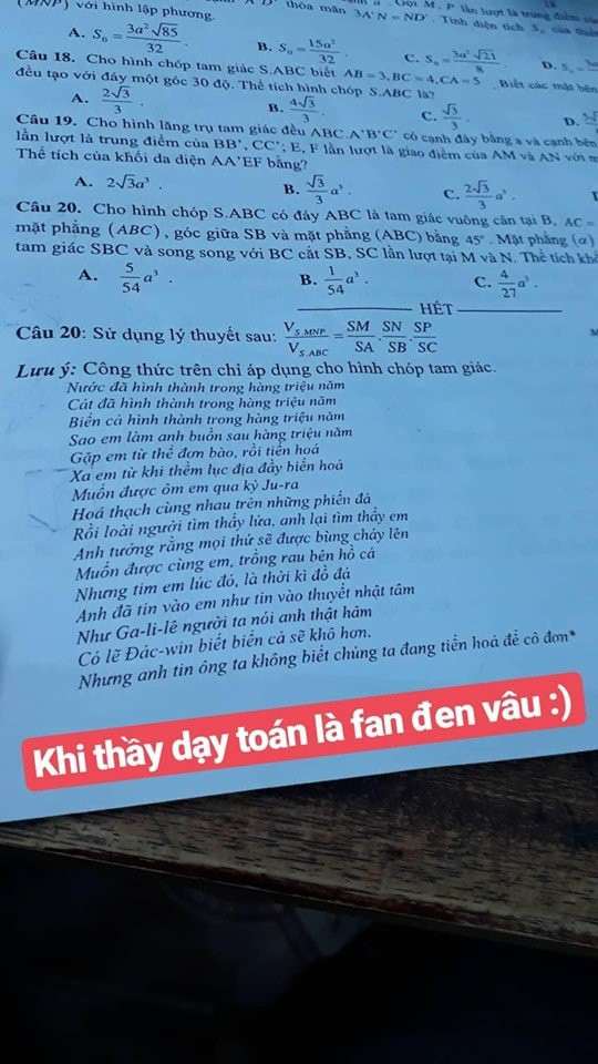 Một trang facebook của học sinh mới đây đăng tải hình ảnh đề luyện tập Toán có in lời bài hát "2 triệu năm" của Đen Vâu, kèm lời chú thích "khi thầy dạy Toán là fan Đen Vâu", khiến học sinh phát cuồng.