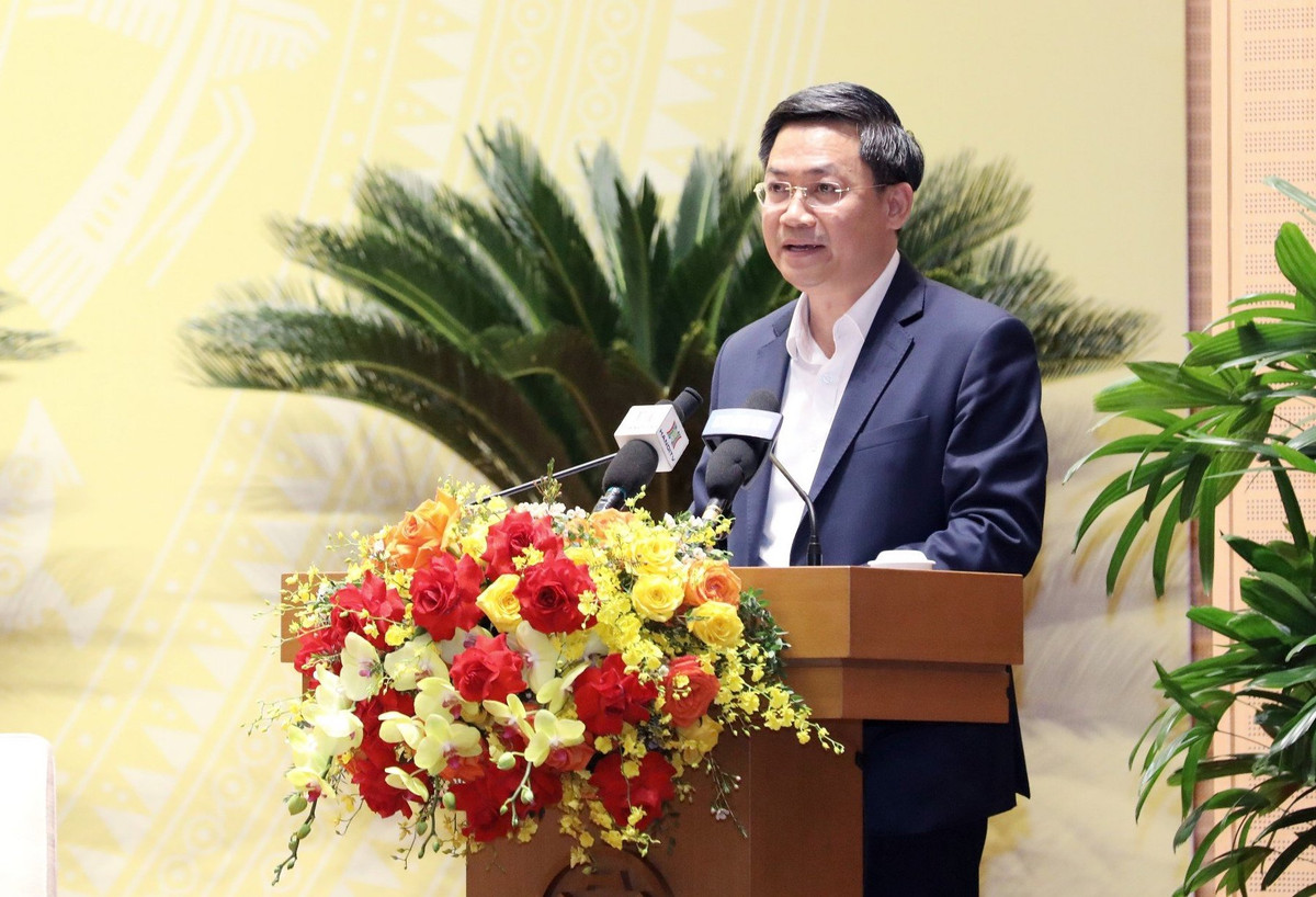 Phó Chủ tịch UBND TP Hà Nội Hà Minh Hải trình bày báo cáo tại hội trường.