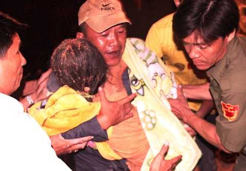 | Bé gái được che ấm khi vừa đưa lên từ độ sâu 80m. Ảnh: VNE |