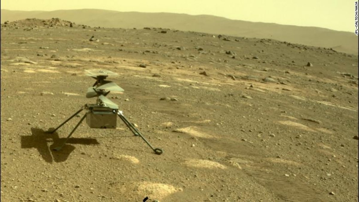 Trực thăng Ingenuity đáp xuống bề mặt sao Hỏa. (Ảnh: CNN)