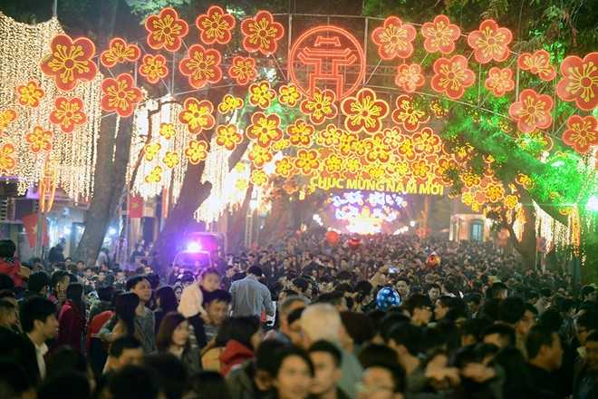 22h, toàn bộ các tuyến phố xung quanh hồ Gươm như biển người. Tràng Tiền Plaza sáng rực thu hút khách chụp ảnh với đèn trang trí.