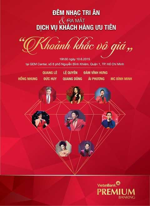 Cam kết luôn mang đến những sản phẩm, dịch vụ tốt nhất, VietinBank đồng thời mong muốn mang đến cho các khách hàng ưu tiên những giá trị khác biệt, tinh tế và đẳng cấp. Đêm nhạc tri ân chủ đề “Khoảnh khắc vô giá”, được đầu tư công phu với ekip sản xuất hàng đầu Việt Nam, là một trong những đặc quyền khách hàng được tận hưởng khi sử dụng và trải nghiệm dịch vụ VietinBank Premium Banking.
