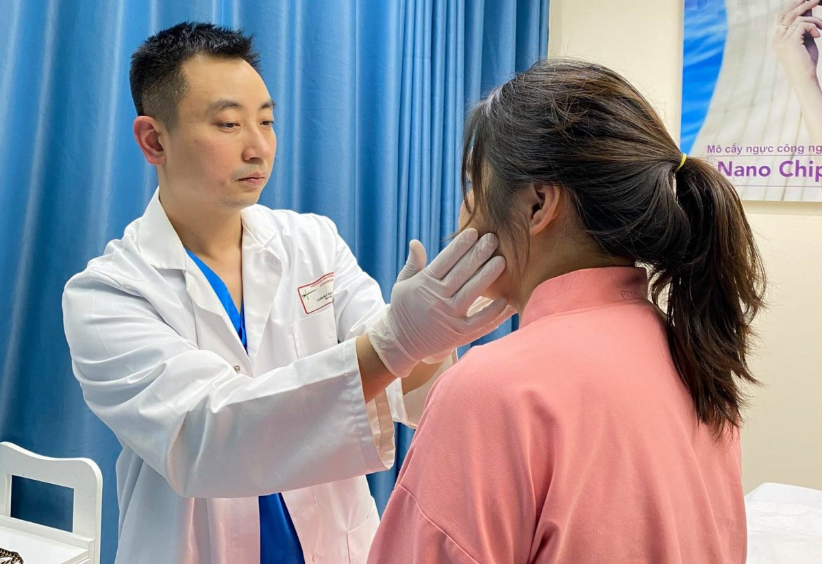 Thạc sĩ, bác sĩ Nguyễn Đình Minh, Trưởng khoa Phẫu thuật tạo hình Thẩm mỹ và Hàm mặt, Bệnh viện E thăm khám cho bệnh nhân.