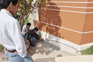 Theo ghi nhận tại công trình, toàn bộ chân tường khu vực nền bên trong nhà thi đấu đều có dấu hiệu lún nứt. Rõ nhất là tại vị trí các chân trụ, hiện tượng lún kèm theo nứt đến gần 10mm, có vị trí sụt lún gây nứt tường lên đến 2cm.