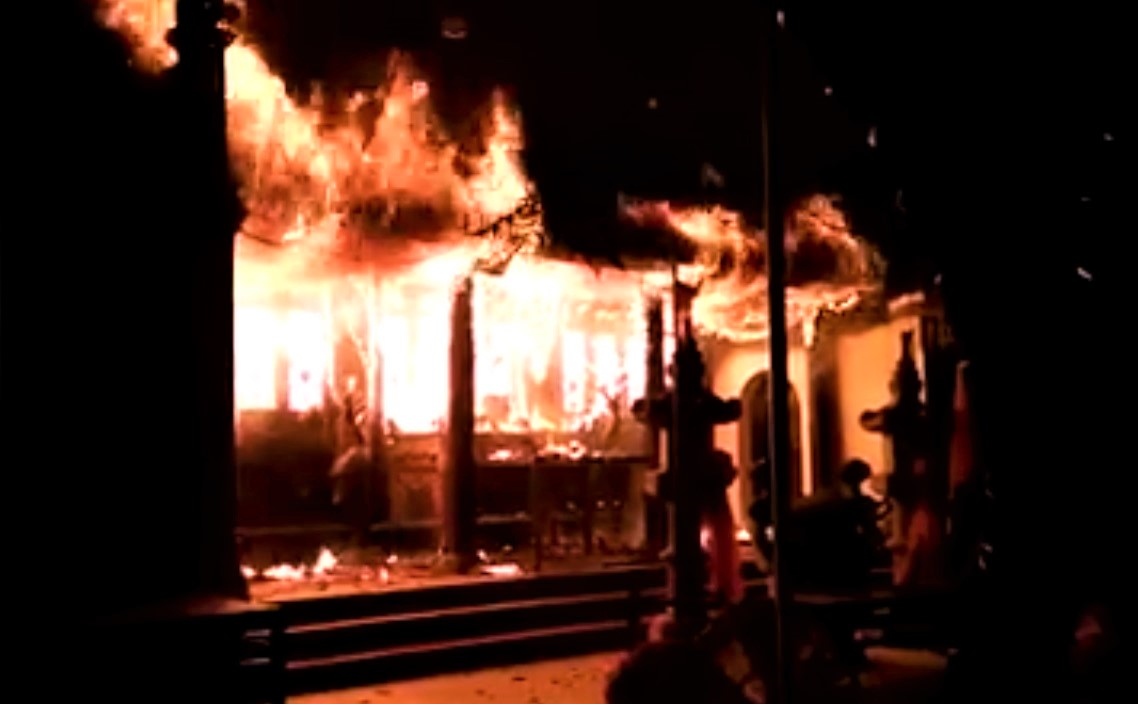Ngọn lửa bao trùm khu vực tam quan đền Tam Quan Lâm Du. (Ảnh cắt từ clip)