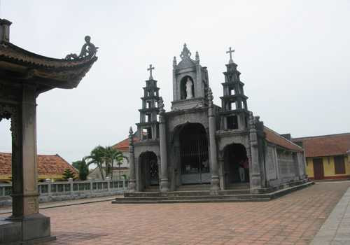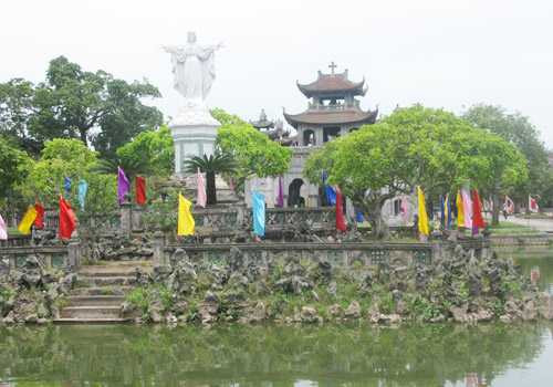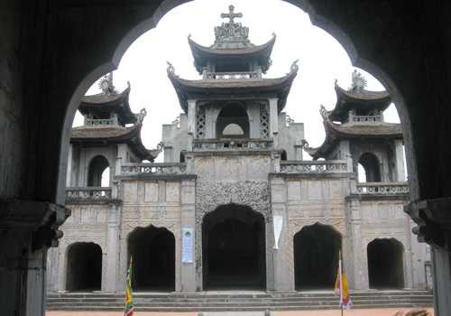 2. Ta quen ngắm những nhà thờ Thiên Chúa giáo với phong cách kiến trúc Gothic tháp nhọn, tháp vuông cao vút, mới thấy lạ khi thăm ngắm nhà thờ Phát Diệm. Nói cho chính xác, nhà thờ Phát Diệm là một quần thể kiến trúc, bởi nó bao gồm một nhà thờ lớn nằm giữa cùng bốn đền thờ nhỏ chầu bốn góc, cùng một không gian bao quanh sơn thủy hữu tình. Nói theo các nhà phong thủy, thì nó đắc địa là ở cái thế, có hồ nước trước mặt và lưng tựa dãy núi cao, trong đó có các hang đá lớn nhân tạo.