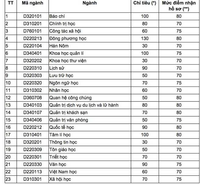 Chỉ tiêu tuyển sinh và mức điểm nhận hồ sơ đăng ký xét tuyển vào ĐH Khoa học Xã hội và Nhân văn (ĐH Quốc gia Hà Nội).