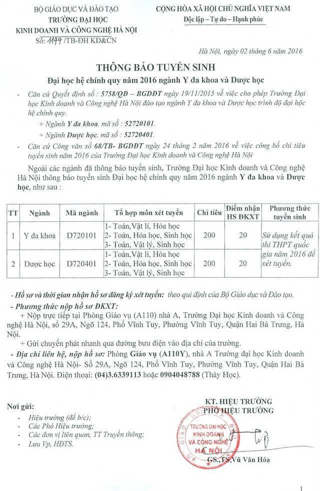 Công văn nêu rõ: Bộ GD-ĐT cho phép trường ĐH Kinh doanh và Công nghệ Hà Nội được tuyển sinh đào tạo Y khoa, Dược học khi trường đã đáp ứng đầy đủ các điều kiện.