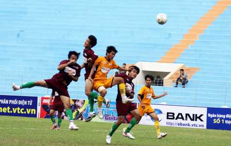 Cú đánh đầu gỡ hòa cho ĐH KTCN Long An của Minh Thành. (Ảnh: Hà Thành)