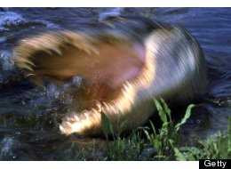 Một con cá sấu hung dữ lộ nguyên hình, nhanh như cắt nó đớp lấy phần đầu của Hudson.