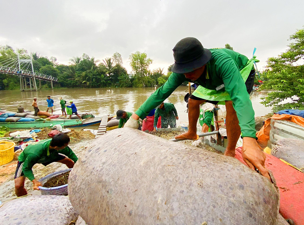 Mờ sáng, chiếc máy sàng ốc bươu tự chế nổ xịt khói bay ngút trời. Hàng chục trai tráng trong xóm, hì hục khuân vác những bao ốc đồng nặng trịch từ dưới ghe lên bờ. Cạnh đó, các anh trung niên thoăn thoắt mở miệng bao, đổ ốc vào máy. Họ chia nhau làm từng khâu thật nhịp nhàng, tạo nên một dây chuyền phân loại ốc sinh động.