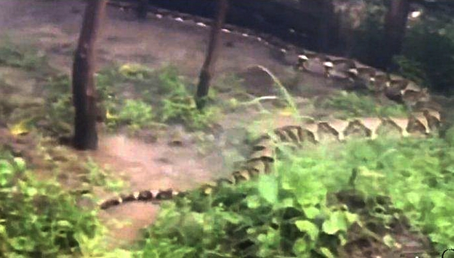 Ngư dân nói trên bắt gặp con trăn khi nó đang bò qua khu đất canh tác của cư dân trong làng. Trước khi bỏ chạy, anh trốn vội vào góc khuất và lấy điện thoại ra ghi hình.