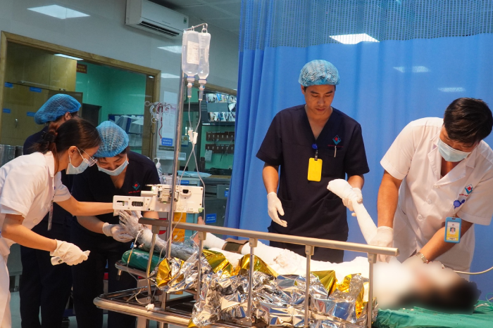 Bệnh nhi được đưa vào viện trong tình trạng tỉnh hoảng loạn, đau đớn, kích thích, bỏng 90% cơ thể, đau tức ngực, khó thở. Các bác sĩ nhanh chóng hồi sức tích cực, giảm đau, chống sốc, bù dịch, vệ sinh băng bỏng toàn thân, đặt ống nội khí quản thở máy.