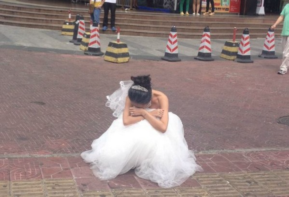 Được biết, đôi nam nữ hẹn nhau đi chụp váy cưới, kết quả là bạn trai đến trước cửa tiệm đồ cưới và đợi bạn gái rất lâu không thấy xuất hiện. Khi cô dâu đến, chàng trai vốn đã rất cáu kỉnh liền đứng bật dậy khi thấy diện mạo của bạn gái.