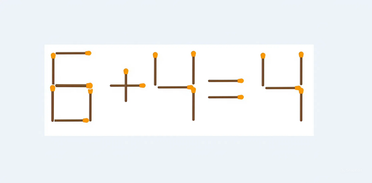 Câu đố đưa ra các que diêm được sắp xếp thành phép tính 6 + 4 = 4 như hình bên dưới. Nhiệm vụ của người chơi là di chuyển một que diêm để tạo thành các phương trình mới đúng với quy tắc toán học.