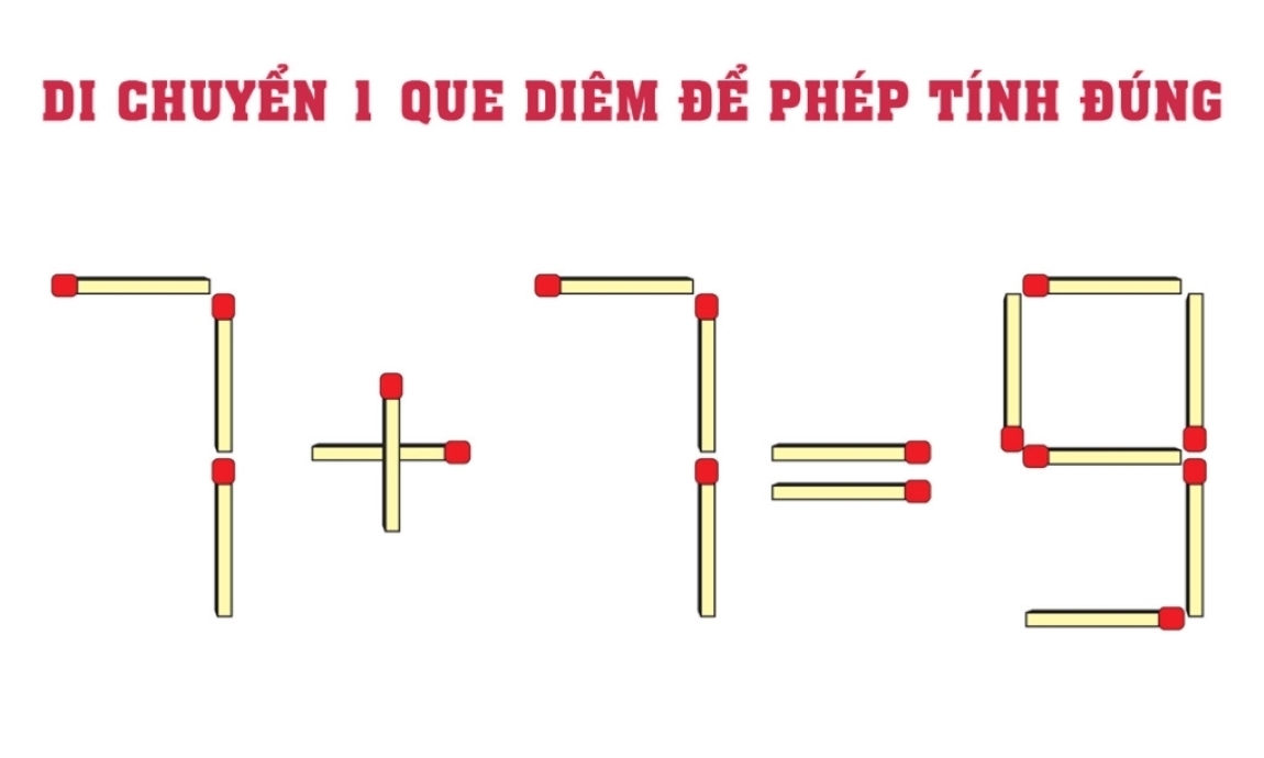 Câu đố này cho trước phép tính 7 + 7 = 9, tuy nhiên, phép tính này lại thực hiện sai. Nhiệm vụ của bạn hãy di chuyển 1 que diêm để phép tính này trở nên chính xác.